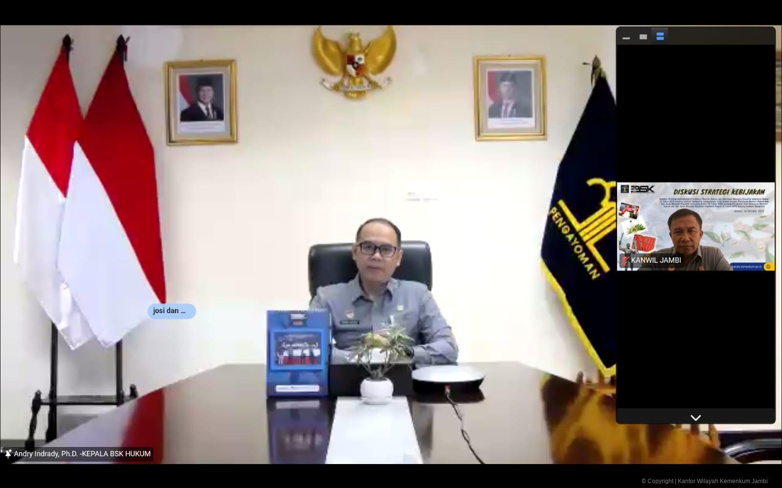 JAMBI, JAMBIEKSPRES.CO.ID – Kepala Kantor Wilayah Kementerian Hukum JAMBI, Jonson Siagian mengikuti Diskusi Strategi Kebijakan (DSK) yang diselenggarakan oleh Kantor Wilayah Kementerian Hukum Maluku secara virtual pada Selasa (14/10/2025).