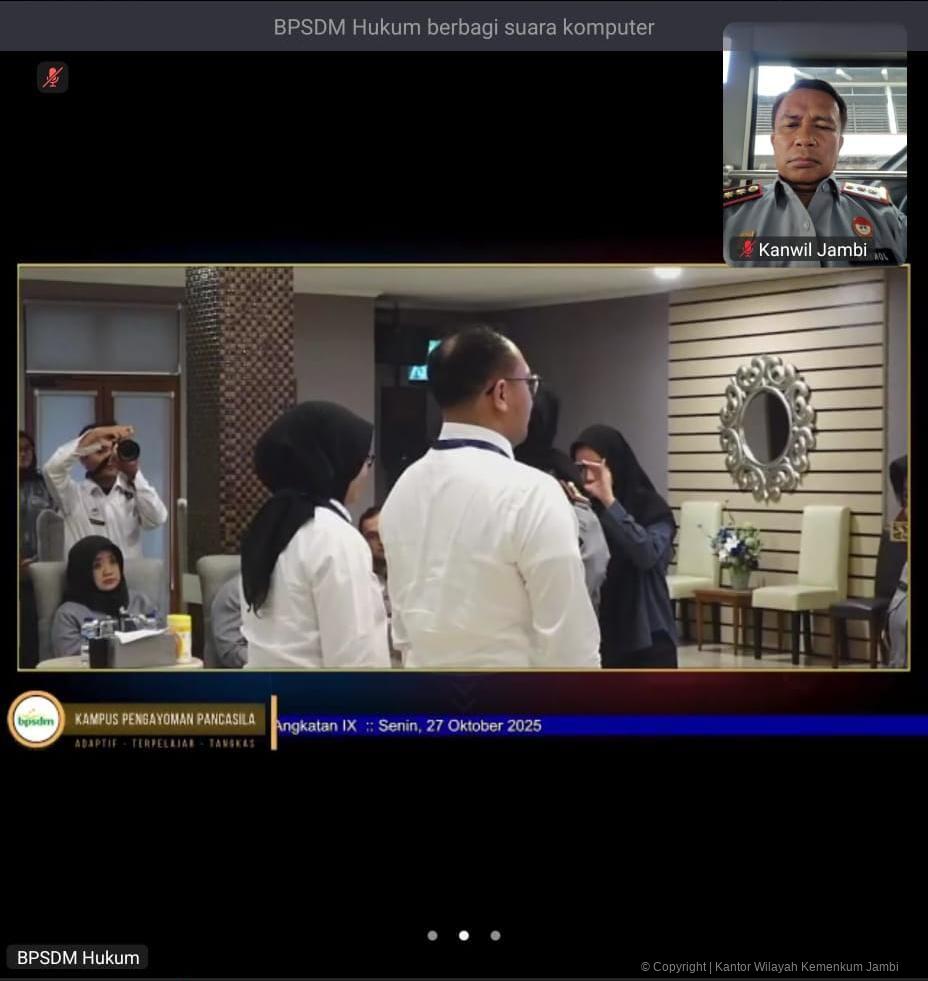 JAMBI, JAMBIEKSPRES.CO.ID — Kepala Kantor Wilayah Kementerian Hukum Jambi, Jonson Siagian, mengikuti kegiatan Pembukaan Training of Facilitator (ToF) Implementasi Kitab Undang-Undang Hukum Pidana (KUHP) Angkatan IX Tahun Anggaran 2025 yang diselenggarakan oleh Badan Pengembangan Sumber Daya Manusia (BPSDM) Hukum dan HAM secara daring melalui Zoom Meeting, Senin (27/10).