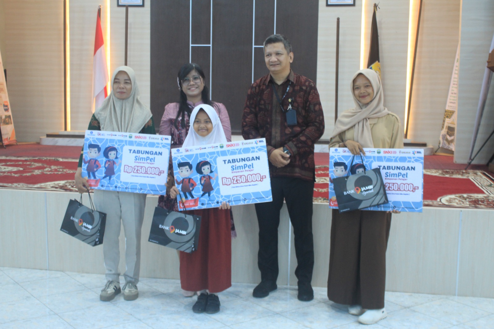 Deputi OJK Provinsi Jambi dan Pemimpin Cabang Bank Jambi Sengeti usai penyerahan simbolis hadiah Simpanan Pelajar (Simpel) Bank Jambi-Foto: Istimewa-