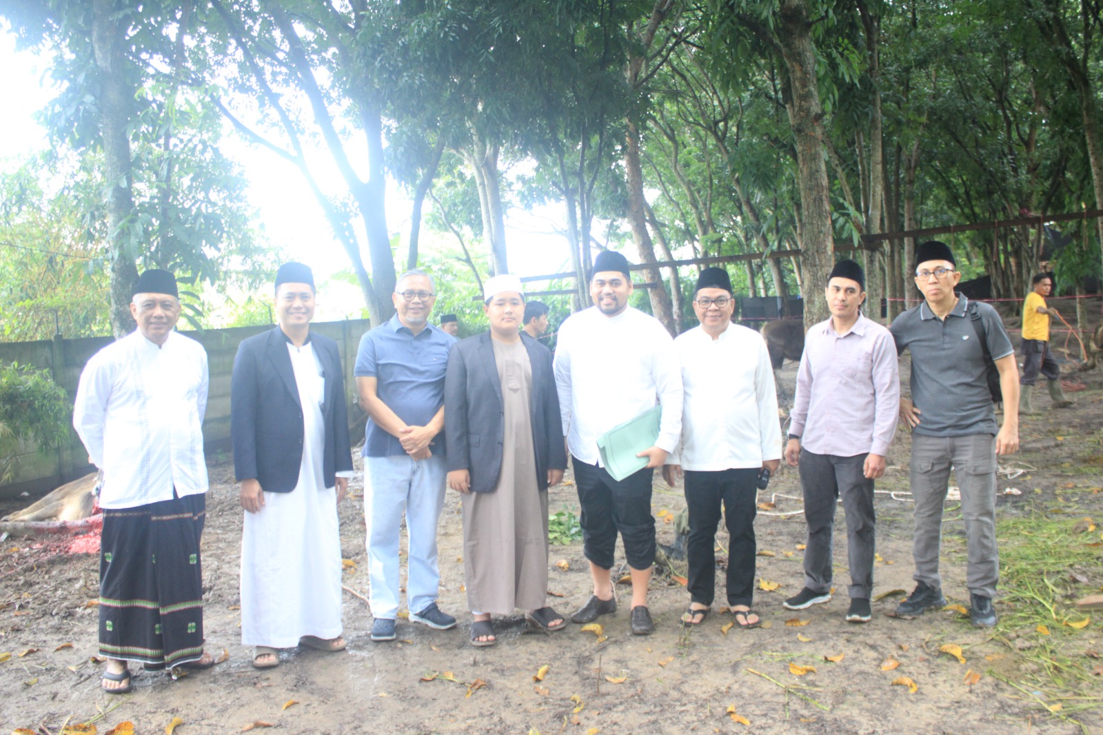 Dirut Bank Jambi, Direktur Treasury Dana, IT dan Digital, Plt Pimdiv Kredit Produktif, Pjs. Pimdiv Treasury dan Dana, Plt. Pemimpin Cabang Utama dan Pemimpin KC Sutomo saat menyaksikan proses pemotongan hewan kurban-Foto: Istimewa-