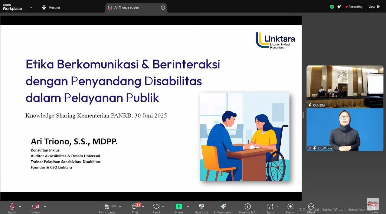 JAMBI, JAMBIEKSPRES.CO.ID - Dalam rangka meningkatkan pemahaman dan kepekaan sumber daya manusia (SDM) terhadap kelompok penyandang disabilitas, Kantor Wilayah Kementerian Hukum JAMBI mengikuti kegiatan Knowledge Sharing bertajuk “Membangun Sensitivitas Disabilitas SDM Pelayanan Publik” yang digelar oleh Kementerian Pendayagunaan Aparatur Negara dan Reformasi Birokrasi (KemenPANRB), Senin (30/06/2025). Kegiatan ini dilaksanakan secara daring melalui Zoom Meeting dan disiarkan langsung melalui kanal YouTube KemenPANRB.