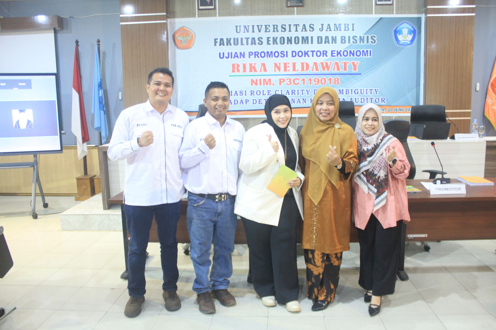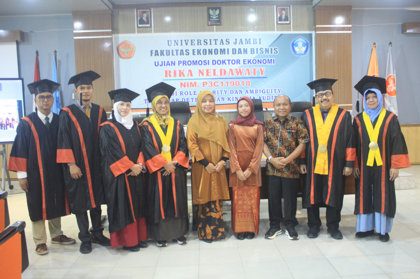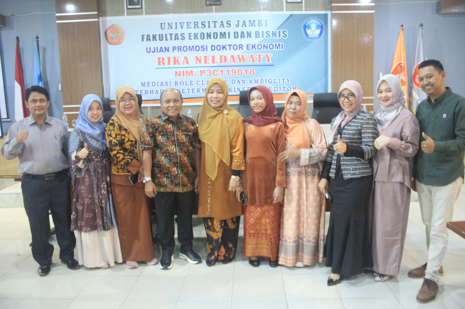 “Ternyata yang berpengaruh adalah komitmen organisasi dan adaptasi teknologi, berarti kinerja auditor itu berpengaruh terhadap komitmen organisasi, dan bagaimana auditor beradaptasi terhadap teknologi informasi, justru komitmen organisasi itu pengaruhnya tidak signifikan, alhamdulillah dari Ujian Promosi Doktor ekonomi FEB-UNJA, Rika Neldawaty mendapatkan nilai A,” urai Ketua Sidang Ketua Sidang Prof. Dr. Shofia Amin, S.E.,M.Si.