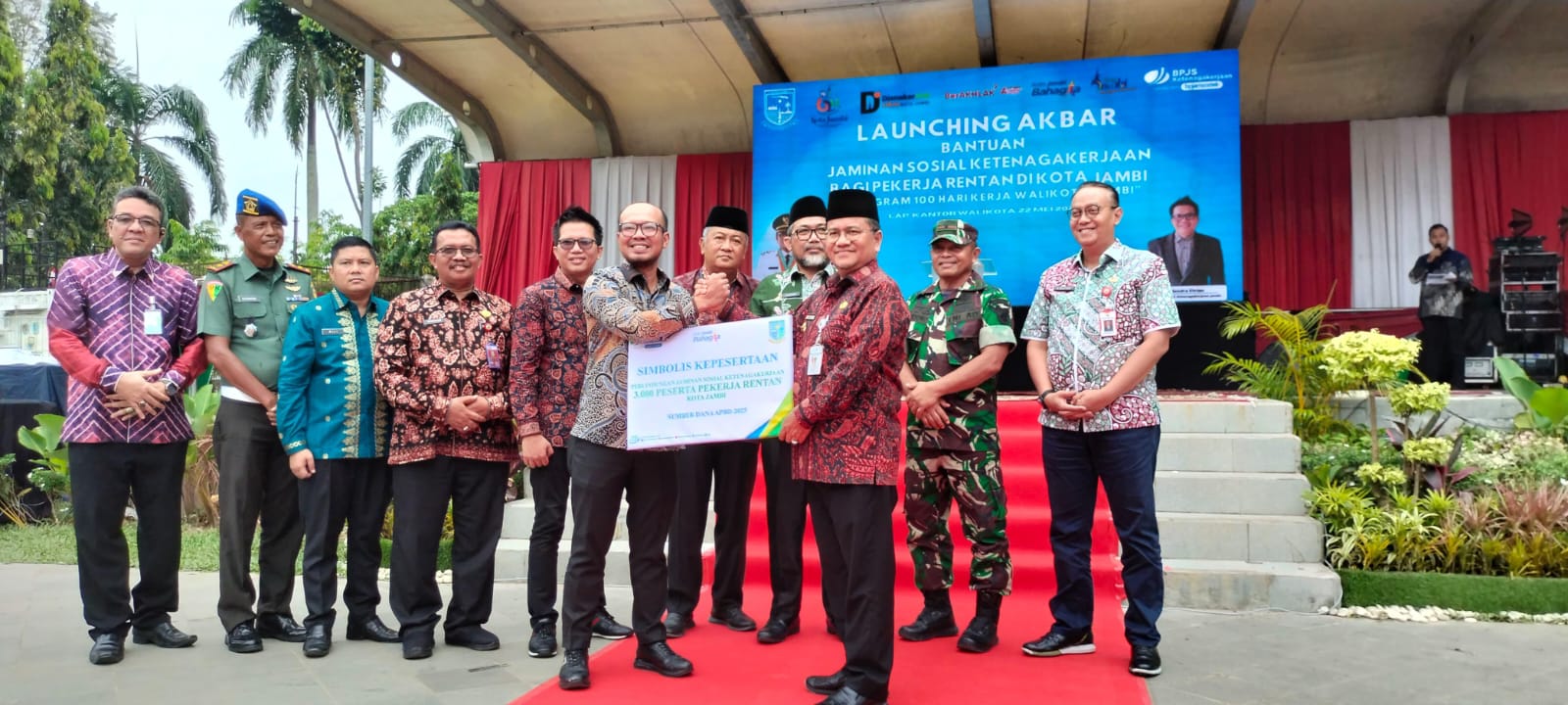JAMBI, JAMBIEKSPRES.CO.ID - Pemerintah Kota Jambi resmi meluncurkan program bantuan Jaminan Sosial Ketenagakerjaan bagi pekerja rentan dalam sebuah acara bertajuk “Launching Akbar Bantuan Jaminan Sosial Ketenagakerjaan bagi Pekerja Rentan di Kota Jambi” yang digelar di Lapangan Kantor Walikota Jambi, Kamis (22/5). Program ini menjadi bagian dari 100 hari kerja Walikota Jambi, Dr. H. Maulana, MKM, bersama Wakil Walikota Jambi, Diza Hazra Aljosha.