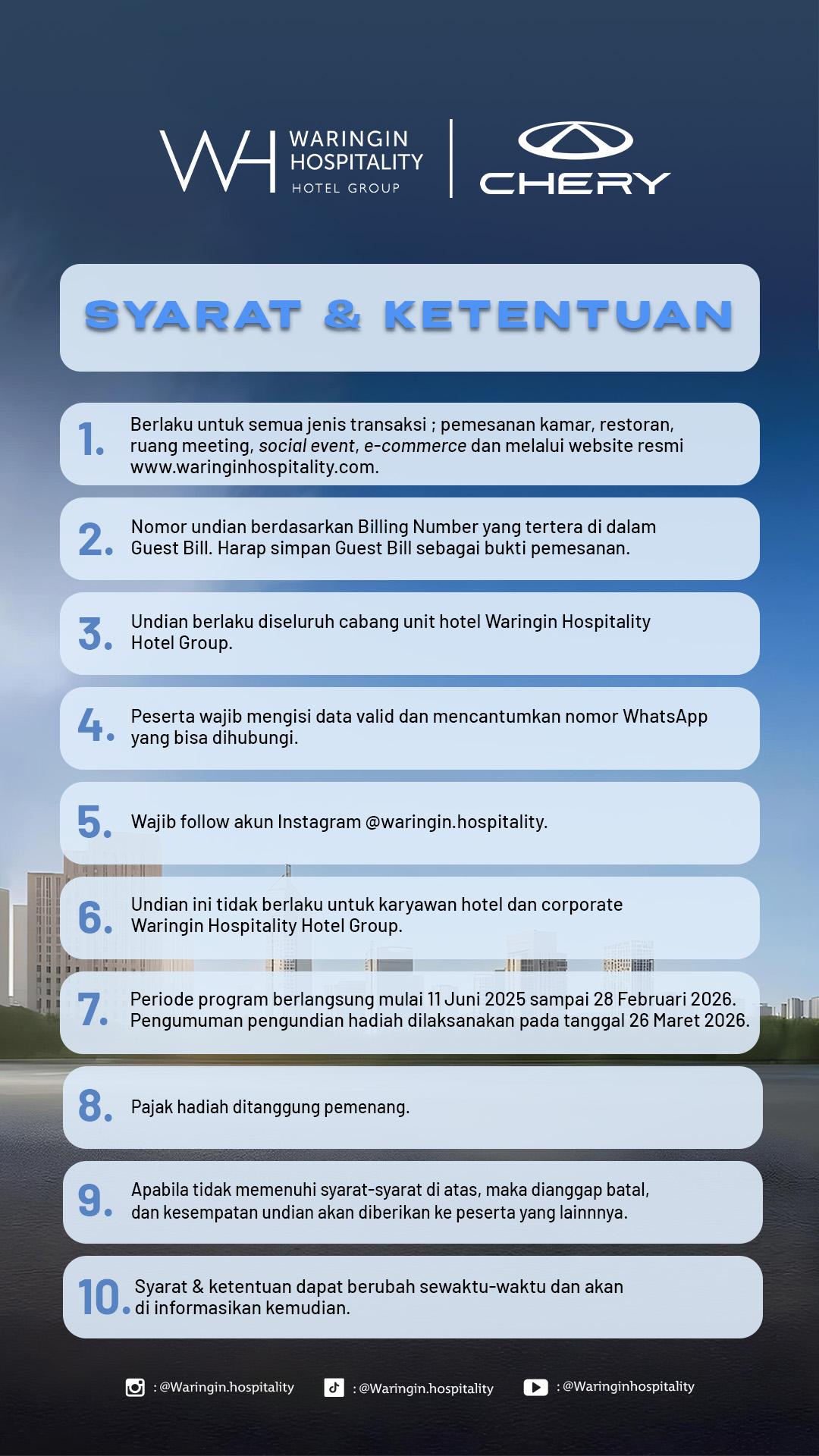 Hadiah akan dikenakan pajak yang ditanggung oleh pemenang. Program ini tidak berlaku bagi karyawan dan pihak internal Waringin Hospitality Hotel Group.