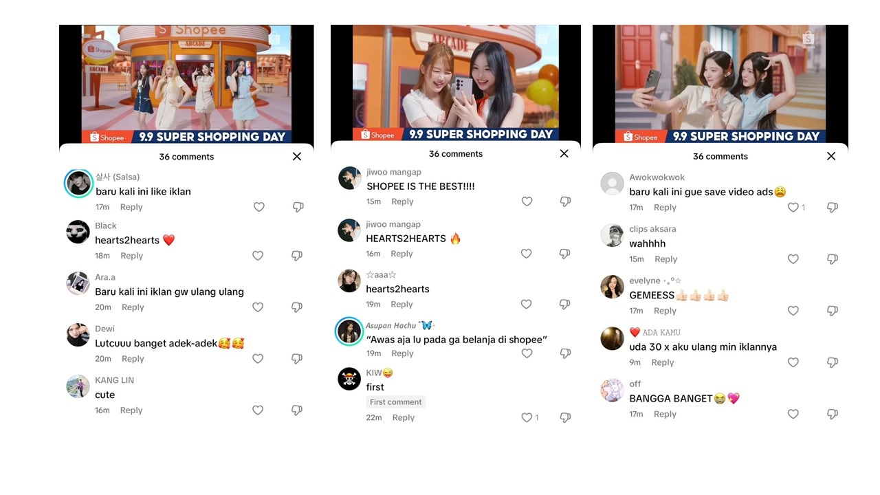 Respon positif juga terus berdatangan dan dapat dilihat pada kolom komentar di unggahan Shopee Indonesia. Banyak yang mengakui kalau campaign Shopee bareng Hearts2Hearts jadi “Janji ga bakalan skip iklan ????????” dan sukses bikin tangan otomatis klik tombol belanja.