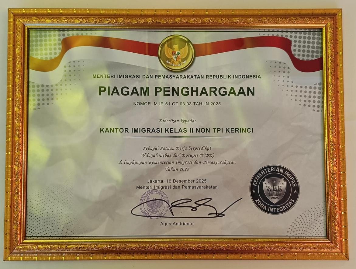 Dengan diraihnya predikat Wilayah Bebas dari Korupsi Tahun 2025, Kantor Imigrasi Kelas II Non TPI Kerinci berkomitmen untuk terus menjaga kualitas pelayanan publik yang transparan, akuntabel, dan berorientasi pada kepuasan masyarakat, serta menjadikan WBK sebagai pijakan menuju pelayanan yang semakin baik di masa mendatang.(adv)
