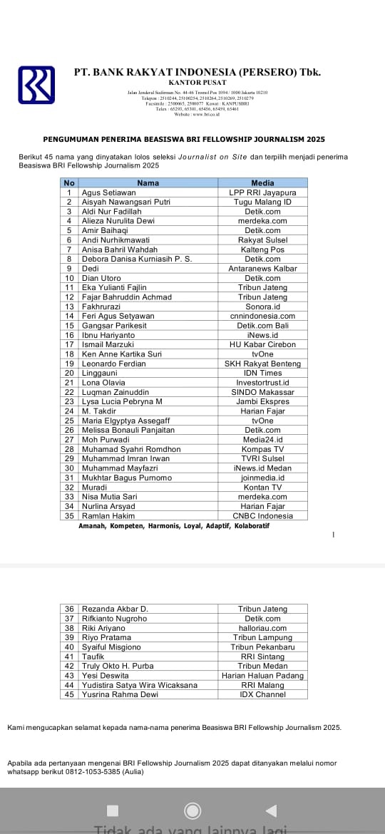 Berikut Daftar Jurnalis yang Lolos Beasiswa BRI Fellowship Journalism 2025--